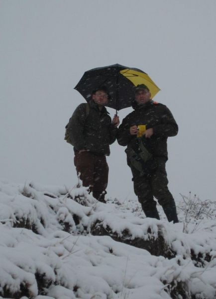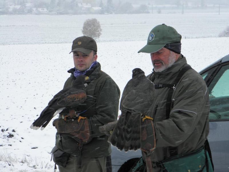 So riefen auch schon die Hörner zum Sammeln. An diesem Morgen wurden sieben Beizvögel auf die Reviere Saline- Kalktal und Schwellenburg aufgeteilt. Bei dem vorherrschenden Wetter ging die Reviereinteilung beinahe unter. Über Nacht hatte der Winter Einzug gehalten. Die andauernden Schneeschauer getrieben durch einen starken Nord- Westwind ließen die Schneedecke auf gut[ zehn Zentimeter anwachsen. Kurz um ein Wetter, bei welchem man keinen Hund vor die Tür schickt! Aber wir wollten ja nicht mit Hunden, sondern mit Beizvögeln jagen und waren auch nicht aus Zucker!