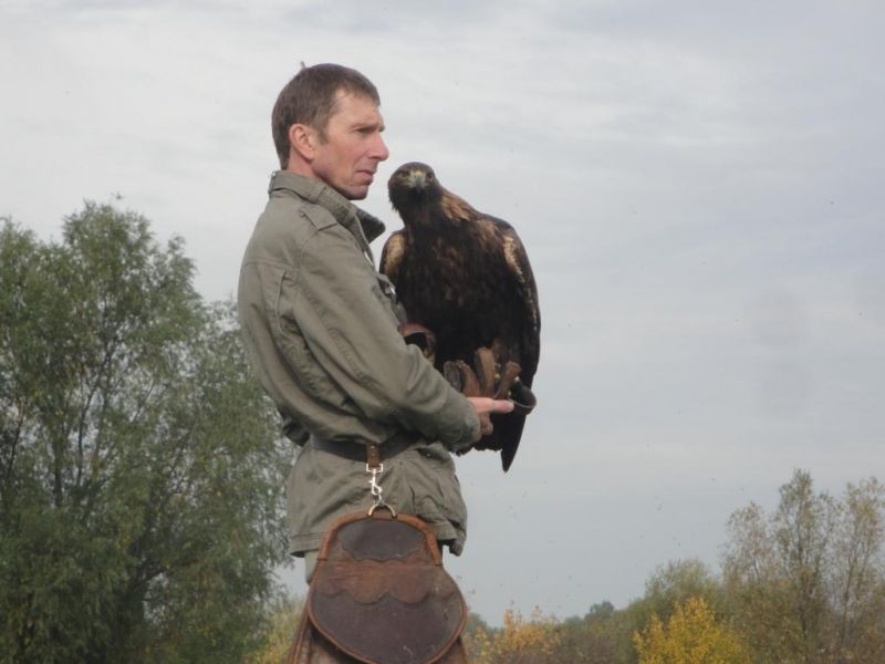 Nach der Pause und weiteren ca. 5 m Raumgewinn im Brombeerdickicht kam erneut der Ruf Haaaase! Der Hase rannte tollkühn an Reiner vorbei. Als er passiert hatte, nahm der Adler die Verfolgung auf. Entschlossen und mit kräftigen Flügelschlägen gelang es ihm zum Hasen aufzuschließen und ihn zu schlagen. Nun erklang, das Falknersheil aus allen Ecken. Erschöpft und mit der ersten Beute in der Falknertasche stärkten wir uns bei Bratwurst undGetränken. Nach der Mittagspause versuchten wir vergeblich entlang der Entwässerungsgräben noch einige Kreaturen aufzuspüren, welche wir mit ruhigem Gewissen am Abend auf die Strecke legen könnten. An einem kleinen Wäldchen angelangt teilte sich die Gruppe auf. Während die Falkner mit ihren Beizvögeln an einer Kante zum Feld warteten, versuchten die Treiber bereitwillig den einen oder anderen Hasen aus einer Sasse zu heben. Tatsächlich konnten sich auch zwei Langohren den Angriffen des Adlers erwehren und verschwanden am Horizont. Da die Zeit schon fortgeschritten war, beschlossen wir die Jagd zu beenden und traten den Rückweg an. Wir genossen noch einmal die Eindrücke dieses wunderschönen Reviers. Wieder am Ausgangspunkt angelangt, bedankten wir uns bei Herrn Hendrich für diesen fantastischen Tag und traten die Rückfahrt zum Tagungslokal an.