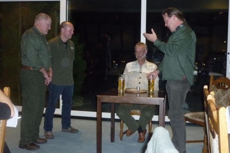 Am Streckenplatz angekommen, verrieten uns die Gesichtsausdrücke der anderen Falkner, dass es in den Kaninchenrevieren nicht so gut aussah. Das Arnstädter Revier war völlig verweist und auch in Saline/ Kalktal war kaum ein Karnickel zu sehen. Aus diesem Grund konnten nach dem ersten Jagdtag 1 Hase, 1 Rebhuhn und eine Taube verblasen werden. Reiner Gulyasch wurde an diesem Abend die Ehre des Jagdkönigs zu Teil. Bei unserer anschließenden Mitgliederversammlung berichtete der Vorstand über die Aktivitäten des zurückliegenden Jahres. Ralf S. informierte uns über die wichtigsten Fakten der Ordensratssitzung von Fulda. Aus den Händen von Olaf Ehrich konnte der Landesverband eine Spende von 400,00 Euro entgegennehmen. Anlass für die Spende war der abgeschlossene Falknerlehrgang, welcher traditionell in enger Zusammenarbeit der Jagdschule Thüringen mit den Referenten des Landesverbandes durchgeführt wird. Freudig konnte der Vorstand verkünden, dass von den acht Jungfalknern zwei den Antrag auf Mitgliedschaft in LV Thüringen gestellt haben. Mittlerweile hat sich die Zahl auf drei erhöht. Nach gewohnt gutem Essen begann das gemütliche Beisammensein, welches im Allgemeinen bis in die frühen Morgenstunden andauerte.